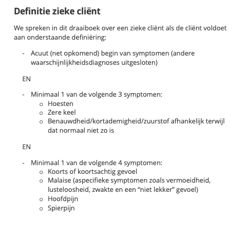 TERUG Heb je een vraag of verbetering voor het draaiboek? Draaiboek luchtweginfecties Definities Doelstelling en doelgroep Testbeleid bij cliënt (en) Werkwijze en verantwoordelijkheden Wijzigingen en versiebeheer Zieke medewerker Zoeken op onderwerp Vul onderstaande vragen in en kijk welke kleurcode van toepassing is Aantal zieke cliënten die isoleerbaar zijn Aantal zieke cliënten die niet isoleerbaar zijn Aantal zieke medewerkers Totaal aantal cliënten van de afdeling Bereken kleurcode Reset Vul waarden in en klik op Bereken GrijsEr zijn max 2 isoleerbare zieke cliënten en Er zijn geen niet-isoleerbare zieke cliënten GeelHet resultaat van de formule is kleiner dan 1/3 en Er zijn meer dan 2 isoleerbare zieke cliënten en Er zijn geen niet-isoleerbare zieke cliënten OranjeHet resultaat van de formule is kleiner dan 1/3 en Er zijn max 2 niet-isoleerbare zieke cliënten Rood Het resultaat van de formule is groter dan 1/3 en/of Er zijn meer dan 2 niet-isoleerbare zieke cliënten BlauwThuiszorg Laatste update: 02-04-2026